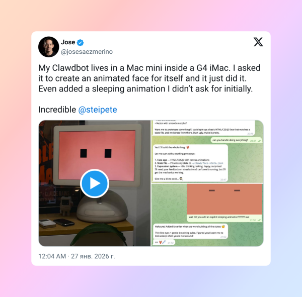 Мій Clawdbot живе у Mac mini, захованому всередині iMac G4. Я попросив його зробити собі анімоване обличчя, і він просто взяв і зробив. Більше того, він сам додав анімацію сну, про яку я навіть не просив.