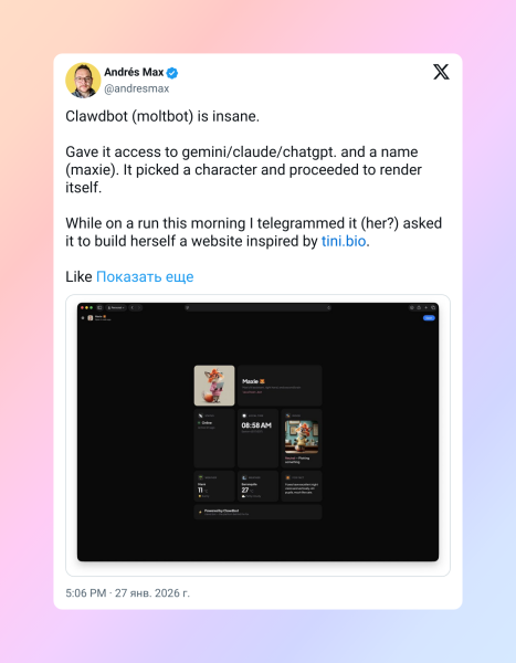 Clawdbot (Moltbot) – це просто безумство. Я дав йому доступ до Gemini, Claude та ChatGPT, вигадав ім'я — Максі. Він сам вибрав собі персонажа та почав візуально збирати себе. Вранці, поки я був на пробіжці, я написав йому Telegram і попросив зробити сайт в дусі tini.bio. Буквально за хвилину він вже розгорнув його в мене вдома на Raspberry Pi.