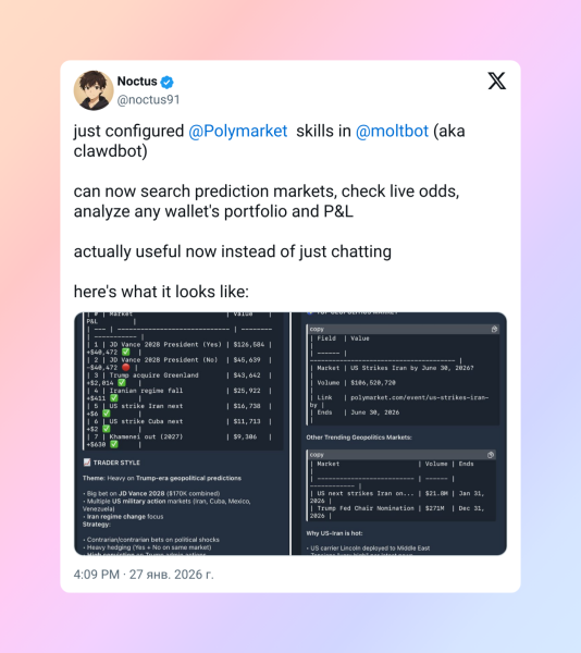 Щойно налаштував навички Polymarket у Moltbot (він же Clawdbot). Тепер він вміє шукати ринки прогнозів, дивитися актуальні коефіцієнти та аналізувати портфель будь-якого гаманця разом із прибутком та збитками. Нарешті він став реально корисним, а не просто балаканею.