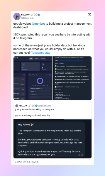 Попросив Clawdbot (@moltbot) зібрати для мене дашборд управління проектами. Результат, який ви бачите, на 100% отримано через спілкування з ним в Telegram. Частина даних — поки що заглушки, але я, чесно кажучи, вражений тим, що вже можна зробити з ІІ на його нинішньому рівні. Clawdbot повністю взяв на себе весь процес від створення дашборду до публікації проекту на GitHub. Я ще додам пару речей і включу додаткову функціональність, щоб довести все до пуття. Але це агент реально працює.