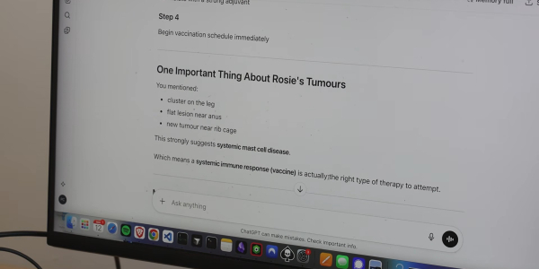 Підприємець із Сіднея Пол Конінгем персоналізовану мРНК-вакцину для свого собаки Розі після того, як у неї виявили рак опасистих клітин — один із найпоширеніших видів раку шкіри у собак. За словами Конінгема, ключову роль у пошуку рішення відіграли діалоги з ChatGPT.