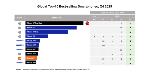 Найпопулярнішим смартфоном кварталу став iPhone 17 Pro Max. Далі йдуть iPhone 17, iPhone 17 Pro та iPhone 16. Серед Android-пристроїв найкраще продавалися Galaxy A56, Galaxy A36 та Galaxy A07.