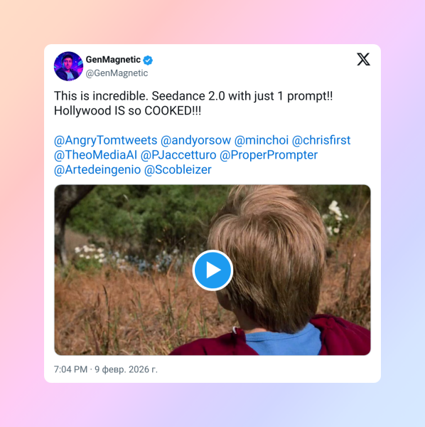 Вірусне відео з двома відомими акторами – лише вершина айсберга. Seedance 2.0 вже близько тижня активно обговорюють у Мережі: користувачі публікують приклади генерації, що дедалі більше вражають, демонструючи, наскільки далеко просунулась якість ІІ-відео. Модель позиціонується як суттєвий стрибок у порівнянні з попередньою версією.
