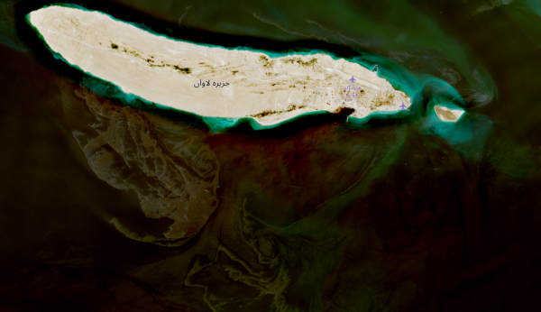 Знімок із супутника, зроблений 10 квітня, демонструє нафту, що рухається біля іранського острова Лаван (ліворуч) у бік острова Шидвар (праворуч), який є заповідником дикої природи. (Зображення: Copernicus Sentinel-2/ESA)