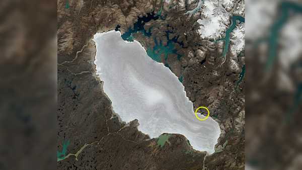 Крижану шапку Барнса найчастіше порівнюють з кеглею для боулінгу через її вигляд згори. Озеро Джі (обведено колом) – одна з декількох водойм, що оточують облямівку льодовика. (Зображення: Copernicus)