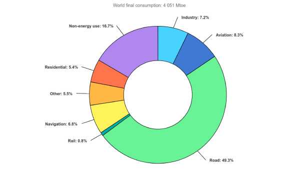 Згідно з даними Міжнародного енергетичного агентства, на автомобільний транспорт припадає 49,3% споживання нафти. (Зображення: МЕА. Ліцензія: CC BY 4.0)