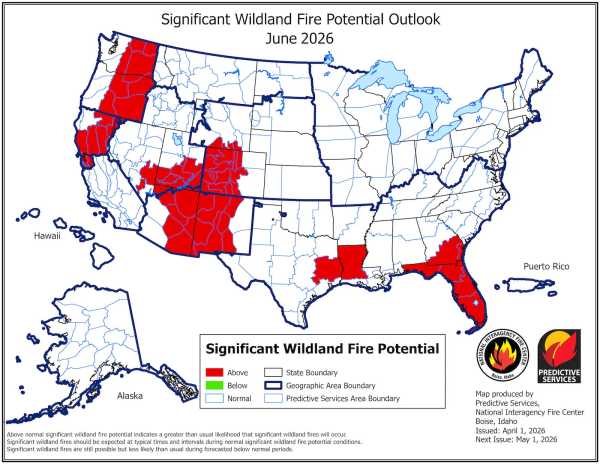 Відповідно до квітневого загальнодержавного прогнозу щодо небезпеки лісових пожеж, на тлі зневоднення ґрунтів та періодів аномальної спеки майже вся західна частина Сполучених Штатів зіткнеться з підвищеною ймовірністю лісових пожеж, що виходить за межі звичайних показників, протягом майбутніх чотирьох місяців.