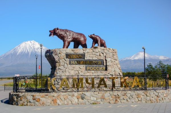 Вийшовши з аеропорту, я одразу попрямувала до стоянки таксі. Ціни тут столичні. Півтори тисячі рублів за трансфер з аеропорту до Петропавловська. Благо таксист виявився душевним і з радістю погодився провести мене «довгим» шляхом. Щоправда, попросив за це п'ятсот карбованців. Водій повіз мене до пам'ятника з ведмедями. Пам'ятник називається «Тут починається Росія» і є скульптурою ведмедя і ведмежа, в роті у ведмедя величезний лосось, а збоку напис: «Тут починається Росія».